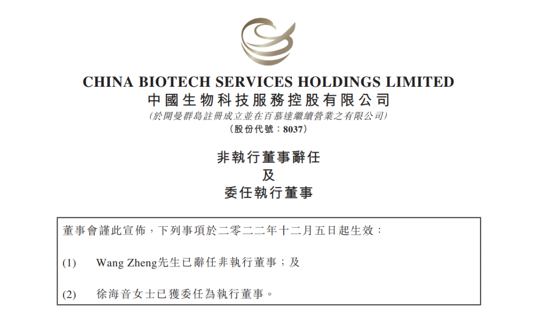 12月5日,中国生物科技服务(以下简称中生科服)发布公告称,Wang Zheng先生因有意投入更多事时间处理其他业务時間,辞任非执行董事;徐海音女士(別名:徐海瑛)委任为执行董事。