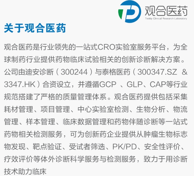 观合医药则是由迪安诊断(300244.SZ)和泰格医药(300347.SZ / 3347.HK)合资设立的一站式临床研究实验室服务解决方案供应商。公司严格遵循GCP法规,符合国际标准,为制药企业、CRO、科研机构提供药物临床研究相关的实验室服务。其丰富的实验室技术与项目管理经验,在药物临床试验领域具有广泛认可。