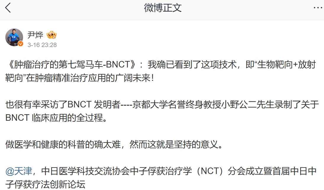 《肿瘤治疗的第七驾马车-BNCT》:我确已看到了这项技术,即“生物靶向+放射靶向”在肿瘤精准治疗应用的广阔未来!也很有幸采访了BNCT 发明者----京都大学名誉终身教授小野公二先生录制了关于BNCT 临床应用的全过程。做医学和健康的科普的确太难,然而这就是坚持的意义。天津中日医学科技交流协会中子俘获治疗学(NCT)分会成立暨首届中日中子俘获疗法创新论坛